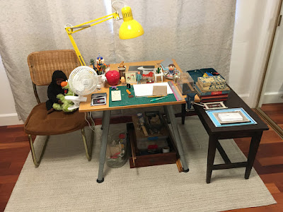 Yes, I realize that my posts have become incredibly sporadic and that I can't keep blaming my inactivity on moving into a new house. But the sad truth is that I'm a very finicky artist who needs everything to be in its proper place before he can get his head right and good for creating. However, I have finally made enough progress in my new office to show it off. Up top you'll see the very good "shrine" to some of my favorite toys that I've made and couldn't bear to sell. Why not join me on a virtual tour of the rest of the space while you're here?